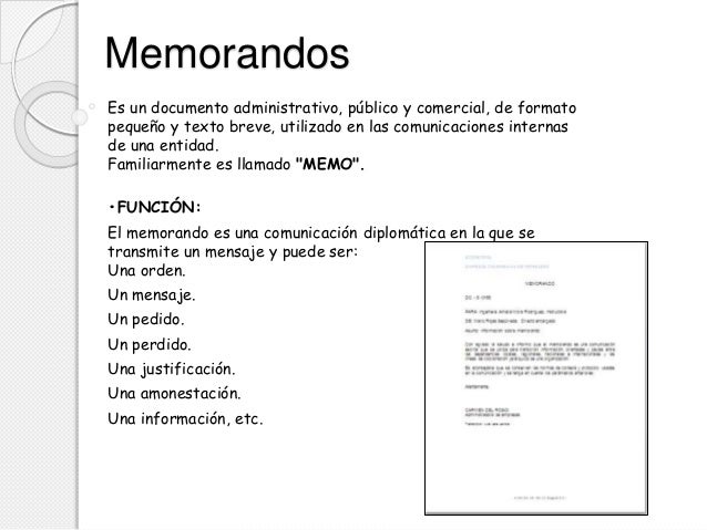 Los documentos más usados en la administración pública son el oficio y el memorando. Hay instituciones que incluso han delimitado el área de difusión de estos documentos: emplean el oficio para su comunicación externa y el memorando para su comunicación interna. Lo mismo que muchas empresas, usan la carta para lo primero, y el memorando, para lo segundo.
